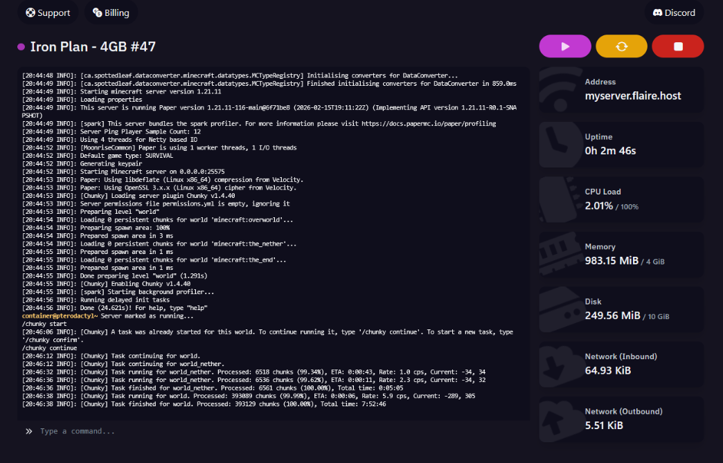 Once a player signs up, they land here. Their server, their files, their settings. It’s all in one place, branded to feel like Flaire’s own product rather than a generic control panel.